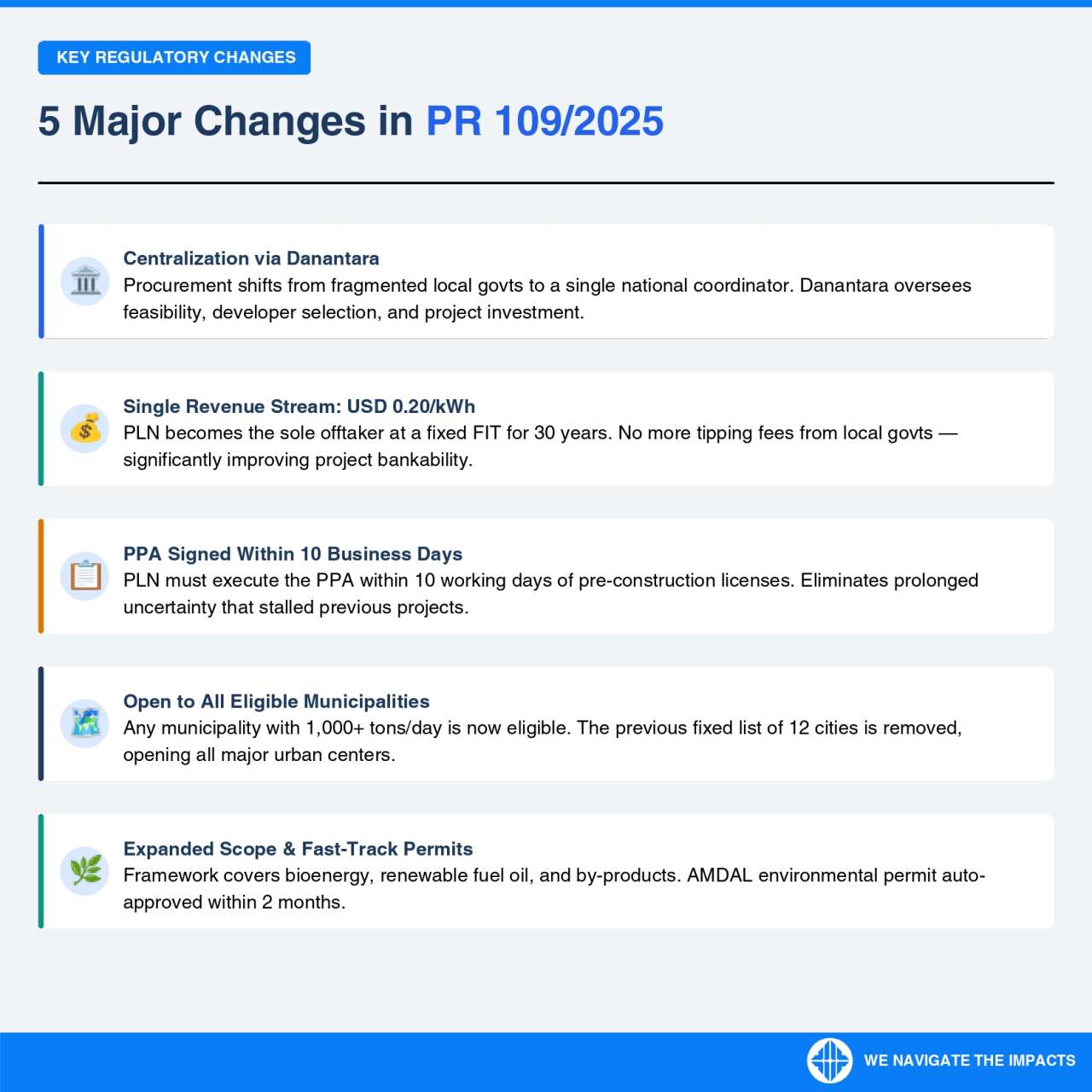 - Lenders and Development Finance Institutions - The fixed USD 0.20/kWh tariff backed by sovereign compensation creates a structurally more bankable project framework than anything previously available in Indonesia's WTE sector. For DFIs and commercial lenders, this is a material improvement. However, monitoring the issuance of implementing regulations — particularly those governing the technical details of PLN subsidy mechanics — remains a critical ongoing task. The quality of the sovereign payment guarantee will ultimately determine the debt serviceability and bankability of individual projects.