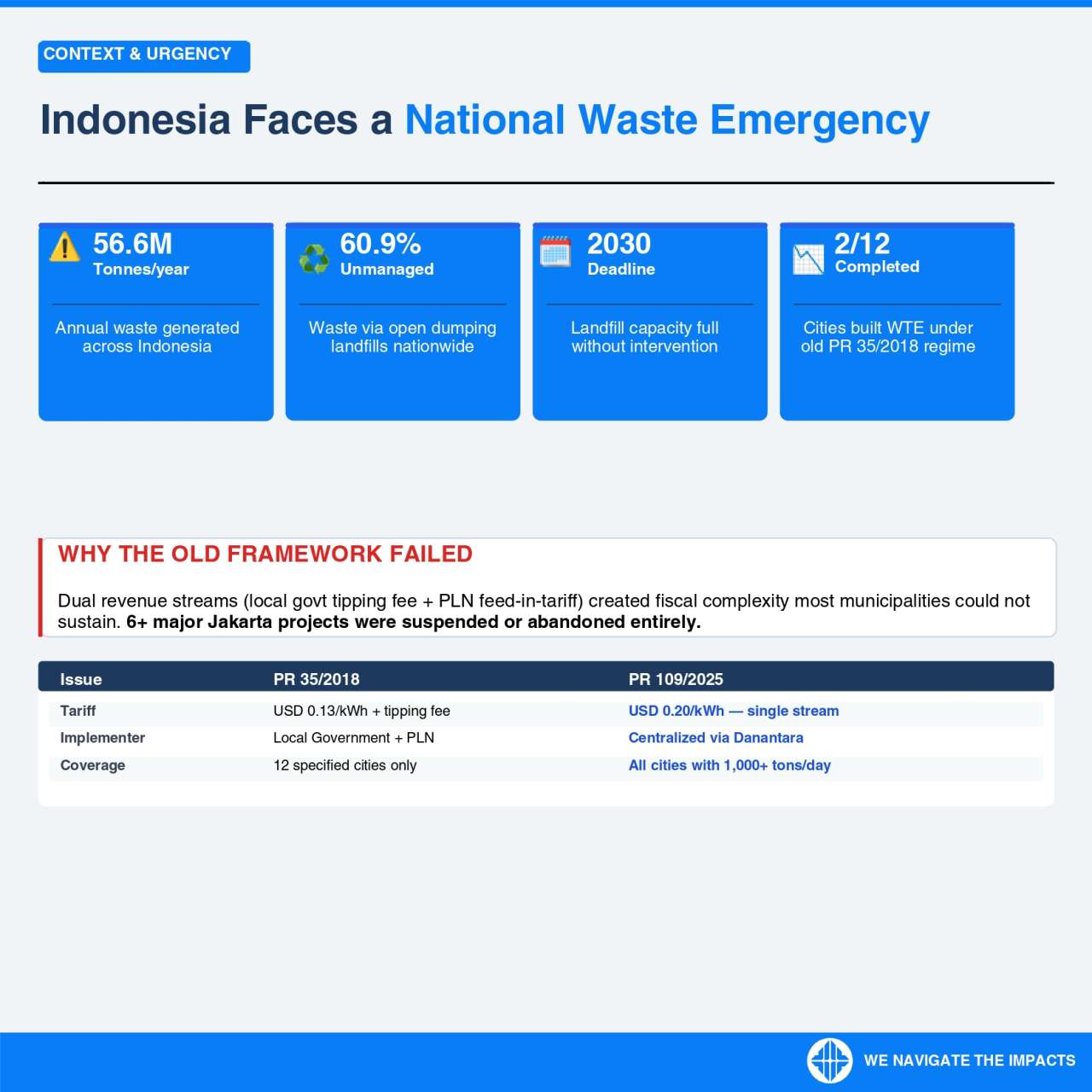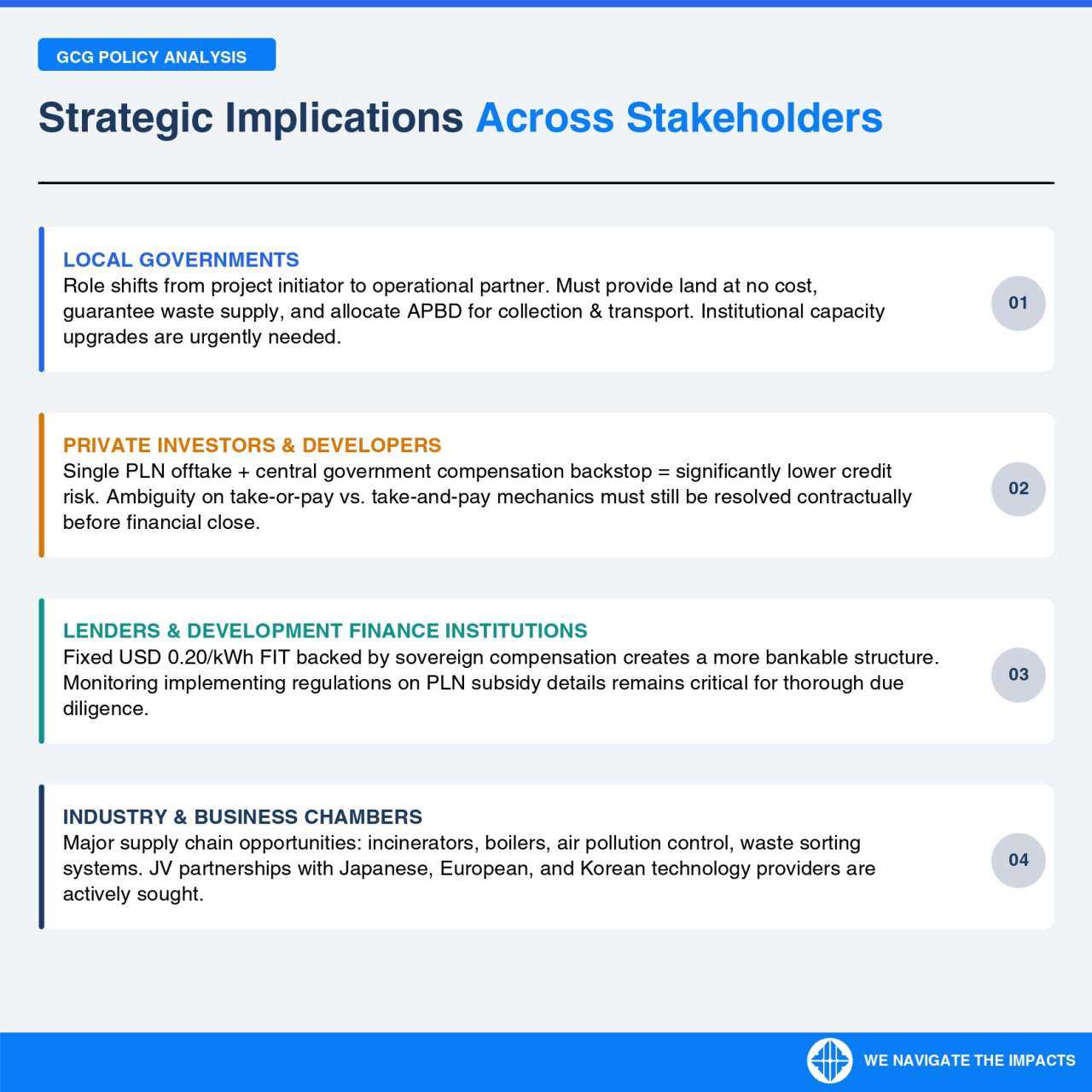 - Lenders and Development Finance Institutions - The fixed USD 0.20/kWh tariff backed by sovereign compensation creates a structurally more bankable project framework than anything previously available in Indonesia's WTE sector. For DFIs and commercial lenders, this is a material improvement. However, monitoring the issuance of implementing regulations — particularly those governing the technical details of PLN subsidy mechanics — remains a critical ongoing task. The quality of the sovereign payment guarantee will ultimately determine the debt serviceability and bankability of individual projects.